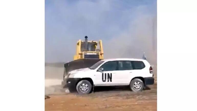 Yol çalışmalarını engellemeye çalışan BM askerlerinin araçları dozerlerle itildi.