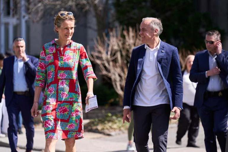 Mark Carney, eşi Diana Fox Carney ile birlikte Ottawa’da oy kullanmaya giderken. AFP